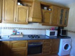 Three Moorish style arches lead into a covered porch area with wrought iron gate and balustrades. The front door opens into a dual aspect lounge with feature fireplace. An archway leads through to a kitchen / dining room which is fully fitted with wood effect units, a corner double sink, gas hob, oven, and washing machine.